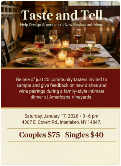 We are under new ownership, entering an exciting new era as a destination for wine lovers, while still being the Americana you know and love - remodeling and opening in 2026.